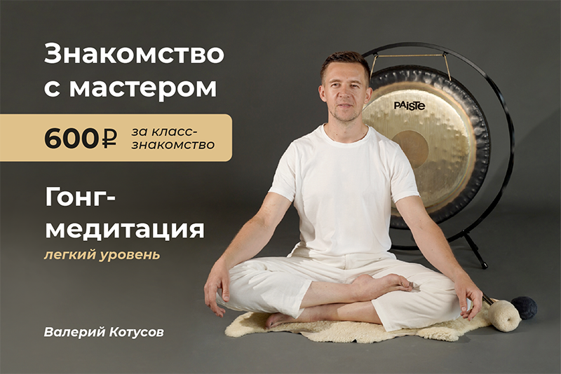 «Гонг-медитация — это тонкая практика работы с подсознанием. Перед практикой мы настраиваемся с помощью дыхания и простых упражнений, плавно подготавливая наше тело, нервную систему и мозг к глубокому очищению через звуковые вибрации гонга».